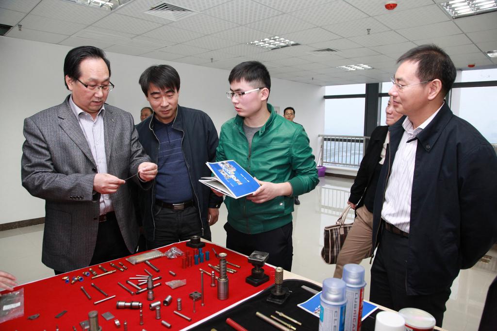 徐文杰(右二)给芜湖市领导介绍自己的产品